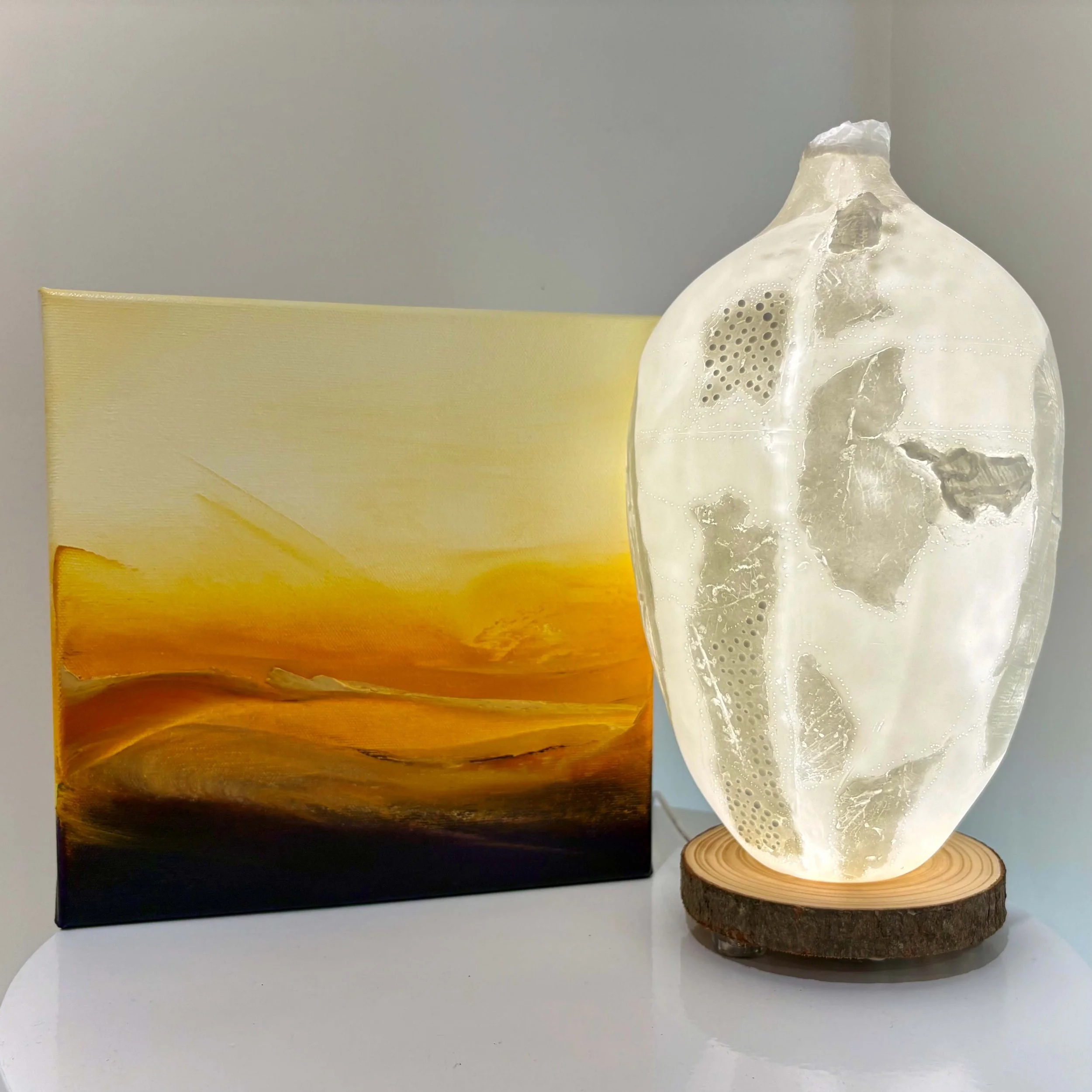 Bringing together poetic abstract paintings, whimsical sculptural forms, and softly glowing ceramic light works, this collection celebrates the subtle beauty of small-scale pieces. Inspired by the warmth and depth of autumn, each work carries a gentle narrative—an emotion, a moment, a memory—offered in colour, texture, and form.