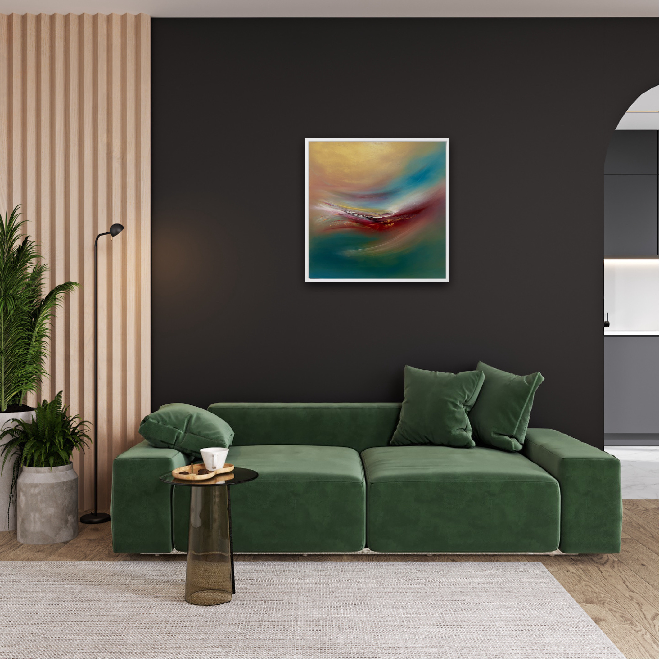 Tranquillity is a serene composition of soft greens, calming blues, and delicate gold hues, with a subtle touch of crimson red, evoking a sense of peaceful stillness. The fluidity of the colours creates a feeling of weightlessness as if floating in a calm, dreamlike space. This painting invites the viewer to experience a moment of tranquillity and inner peace, where time slows and the soul finds rest.